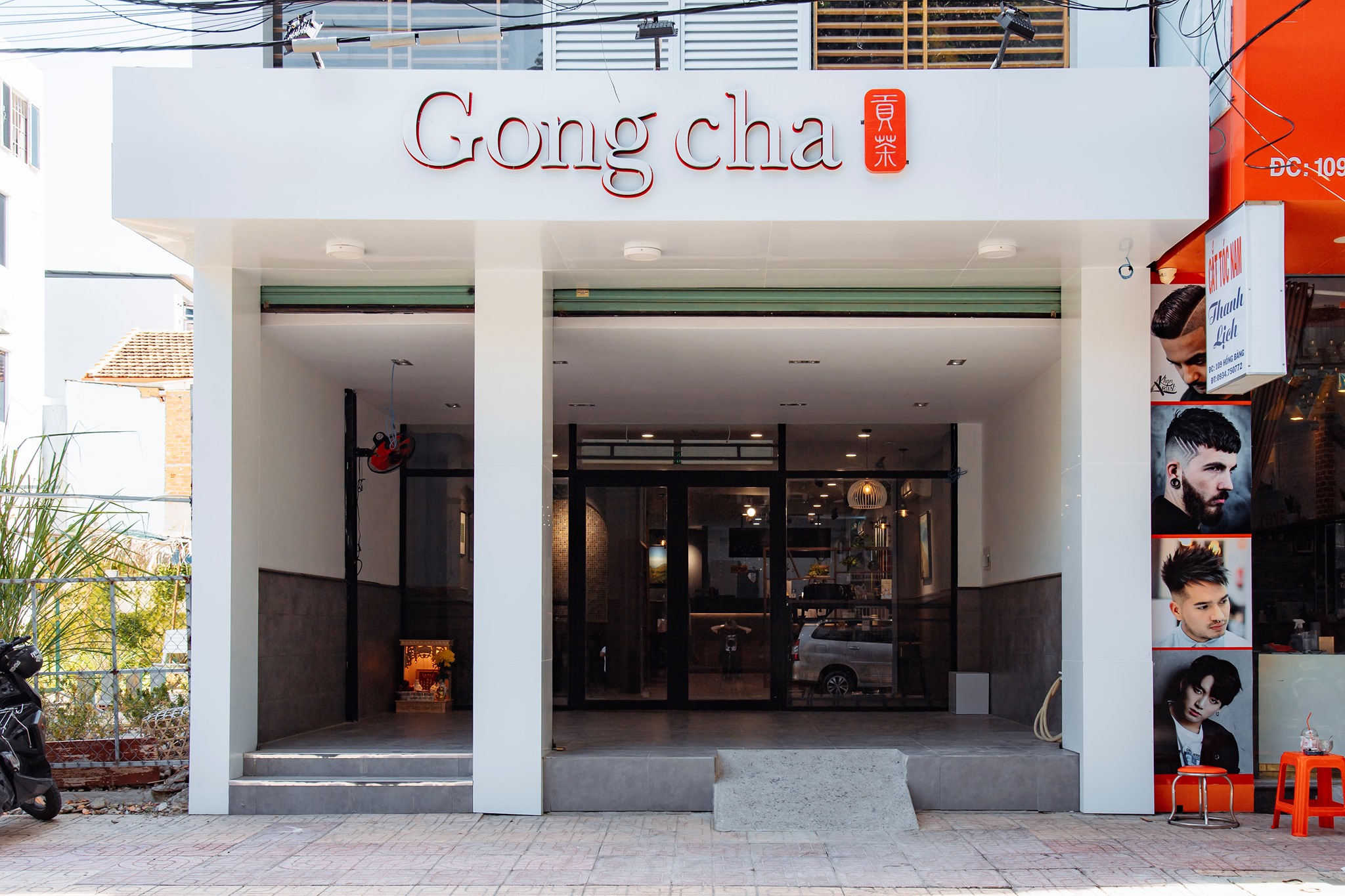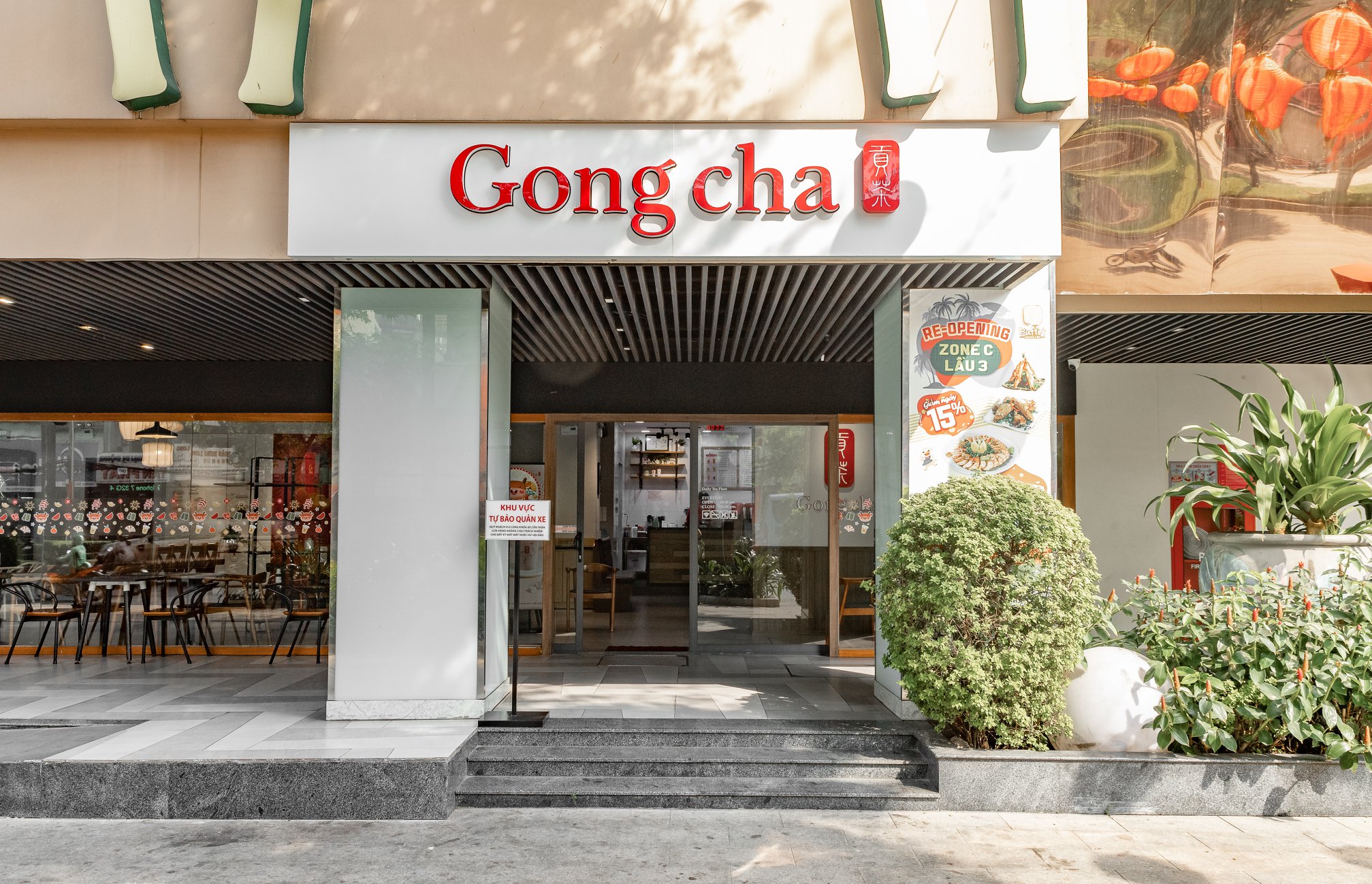 • Biển hiệu và bảng quảng cáo thu hút: Biển hiệu và bảng quảng cáo tại các cửa hàng Gong Cha được thiết kế nổi bật với logo thương hiệu màu đỏ đặc trưng, thu hút sự chú ý của khách hàng.