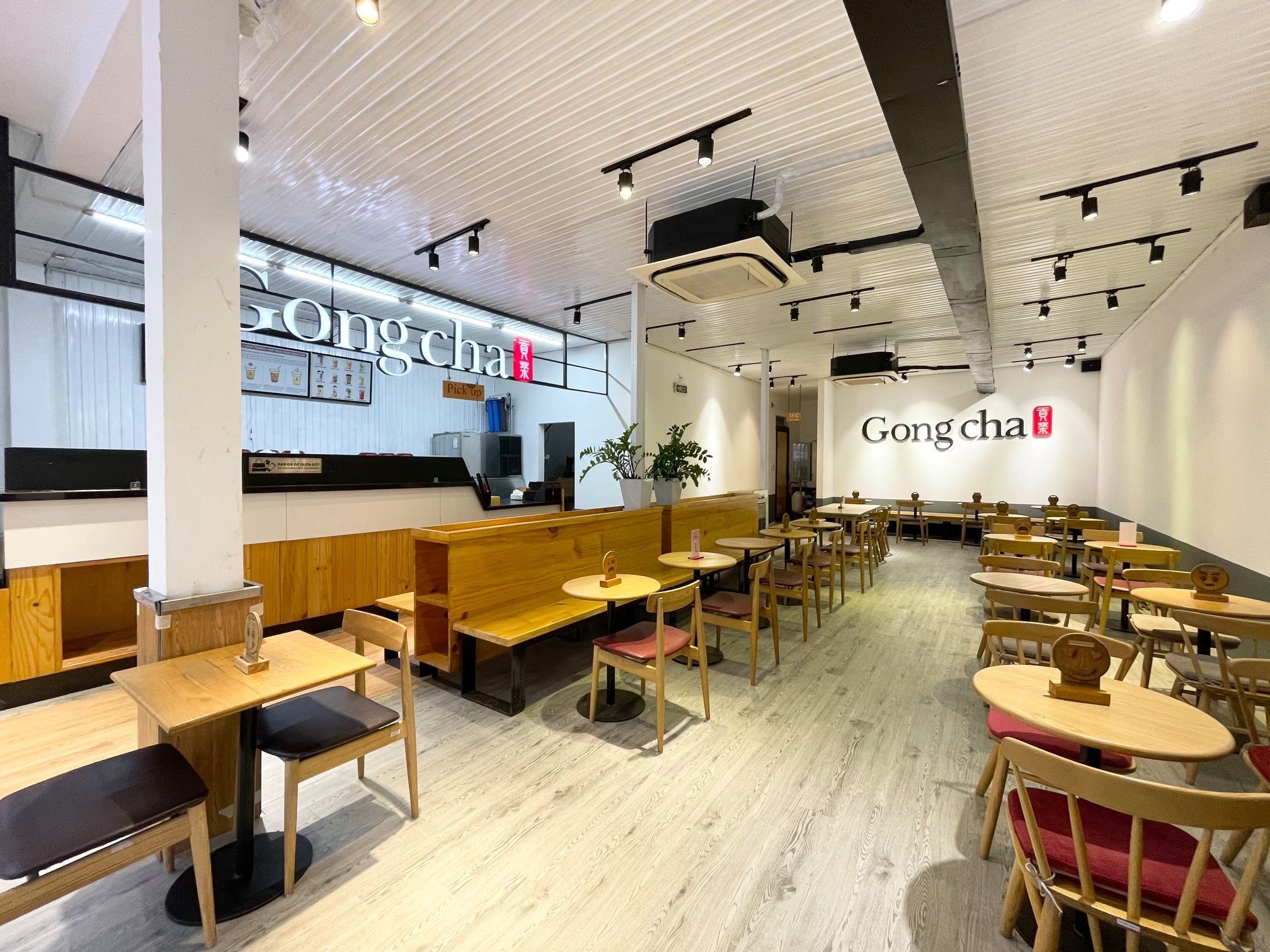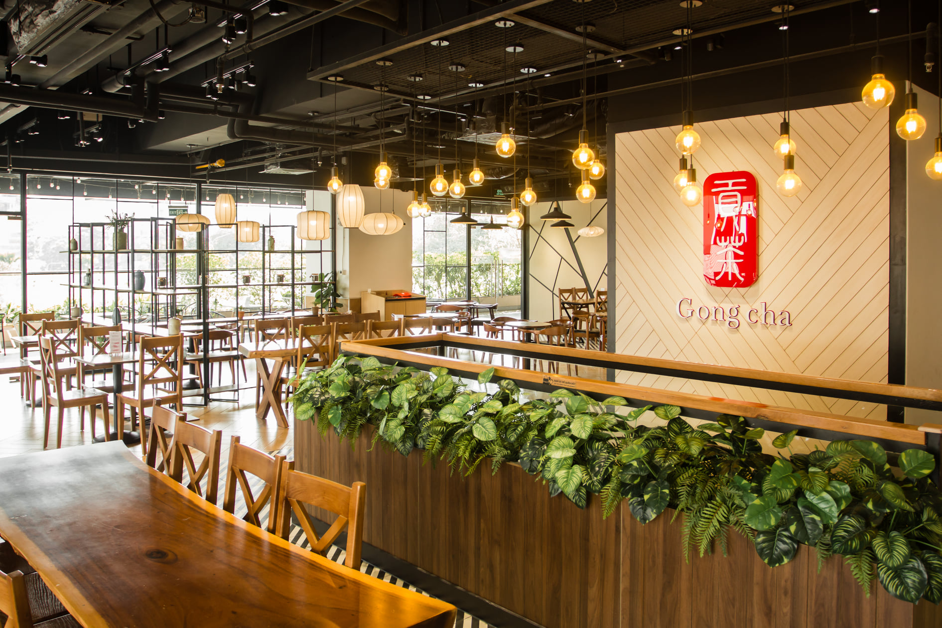 • Chất liệu và vật dụng cao cấp: Chất liệu sử dụng trong thiết kế các cửa hàng Gong Cha thường là gỗ, kim loại, kính, tạo sự hiện đại và sang trọng. Vật dụng trang trí được sử dụng tinh tế, tạo điểm nhấn cho không gian như tranh ảnh, đèn lồng, cây xanh,…